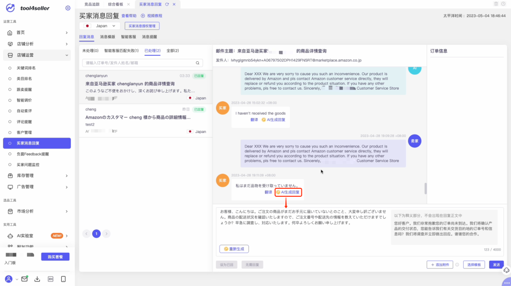 点击左上角选择店铺,可查看所有店铺或者单一店铺的邮件。点击某一邮件,买家消息内容会在中间显示,在下方可直接进行邮件回复,右侧为订单详情(如有),点击商品图片,可链接至亚马逊店铺商品;在对话框内可以直接输入文字发送给买家,或者使用智能文案优化,让系统智能优化文案并翻译为指定语言,我们也可以将常用文案设置为模板,在需要的时候快捷回复。
