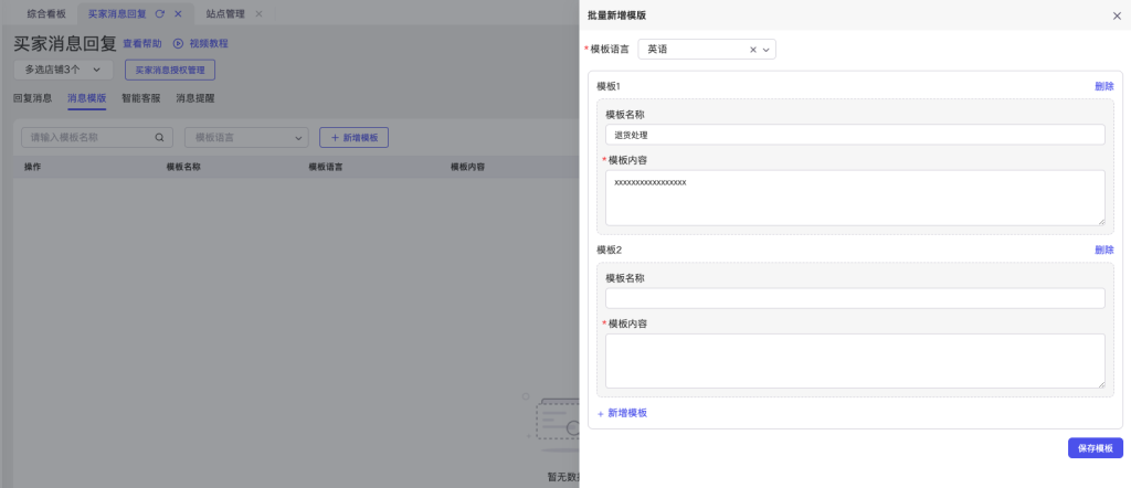 2. 点击新增模板,依次设置模板语言,模板名称与模板内容。点击模板下方的”新增模板“,可以进行连续设置,提升操作效率。设置完毕后点击保存模板。